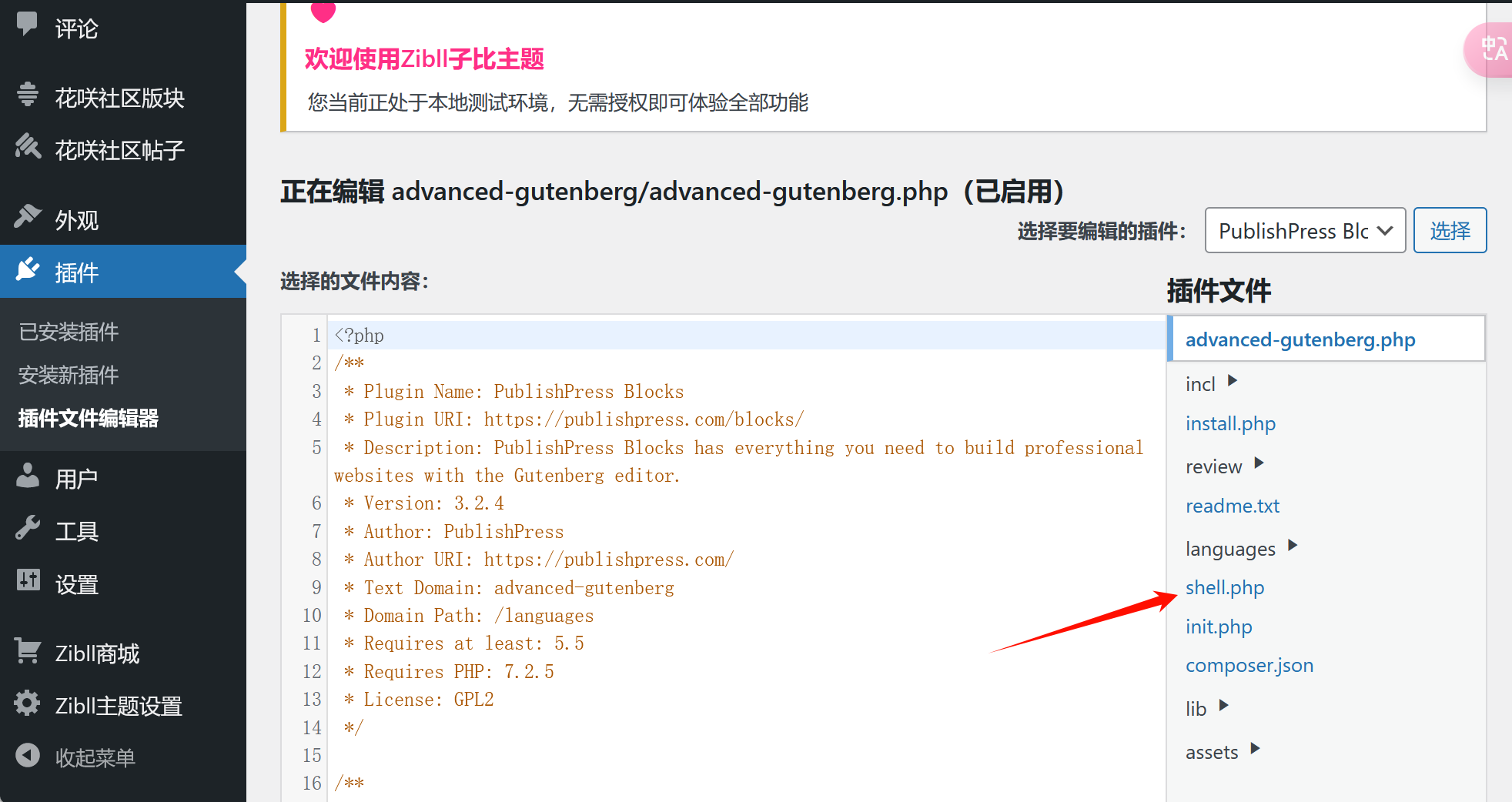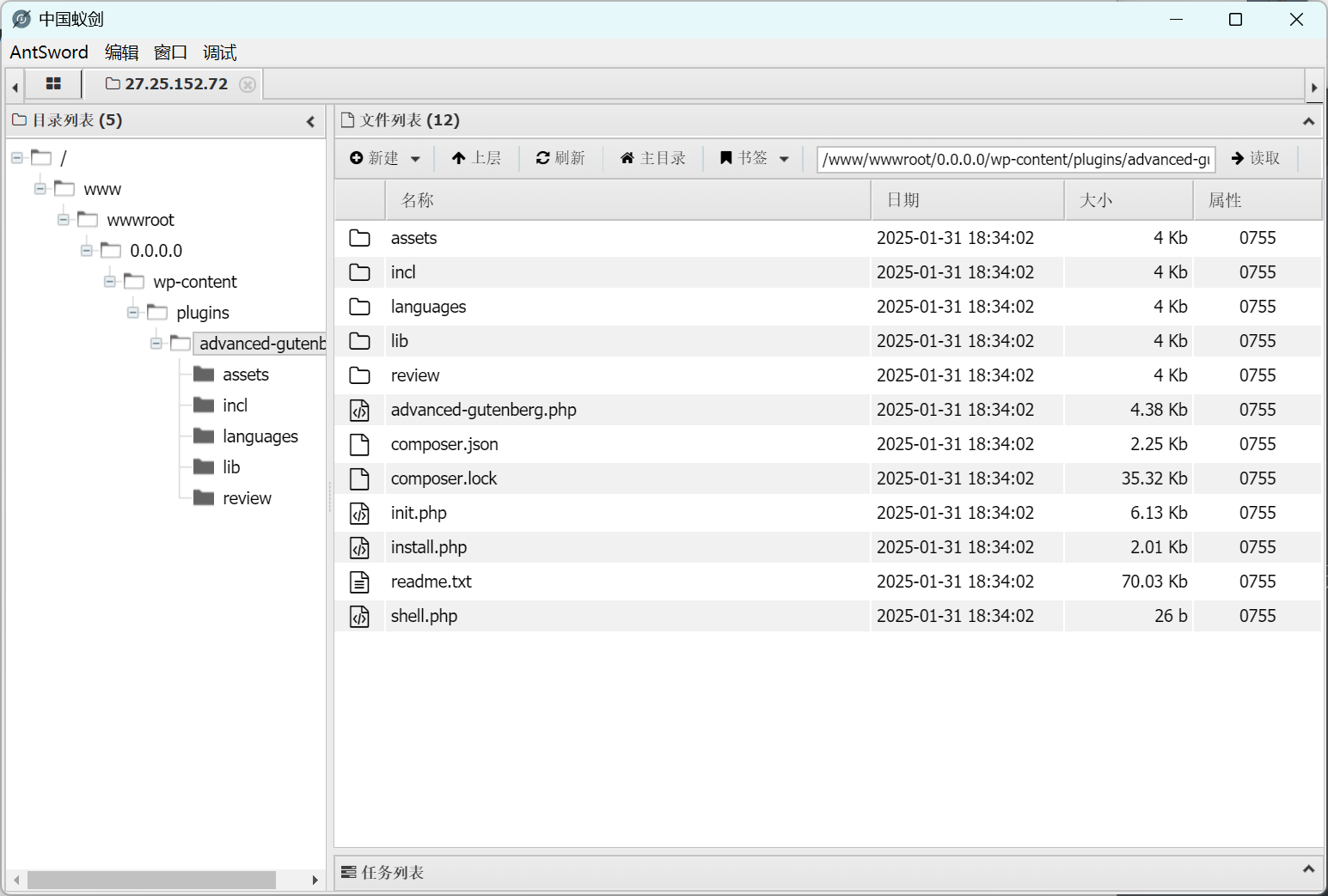 启用插件,查看可以看到插件已经成功加载,shell.php 文件也存在