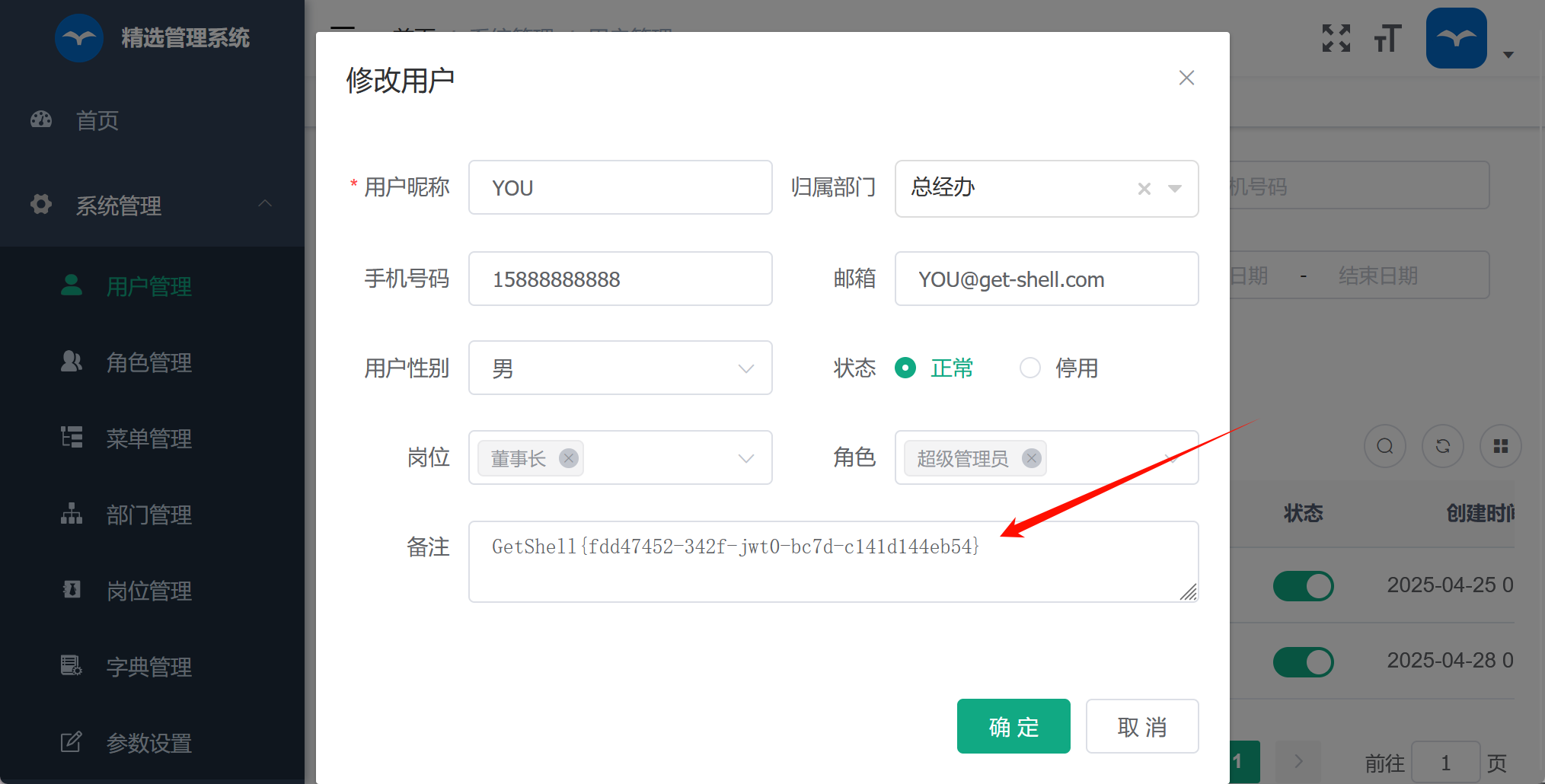 进入后台之后,根据提示,在 用户管理->备注 中拿到 flag