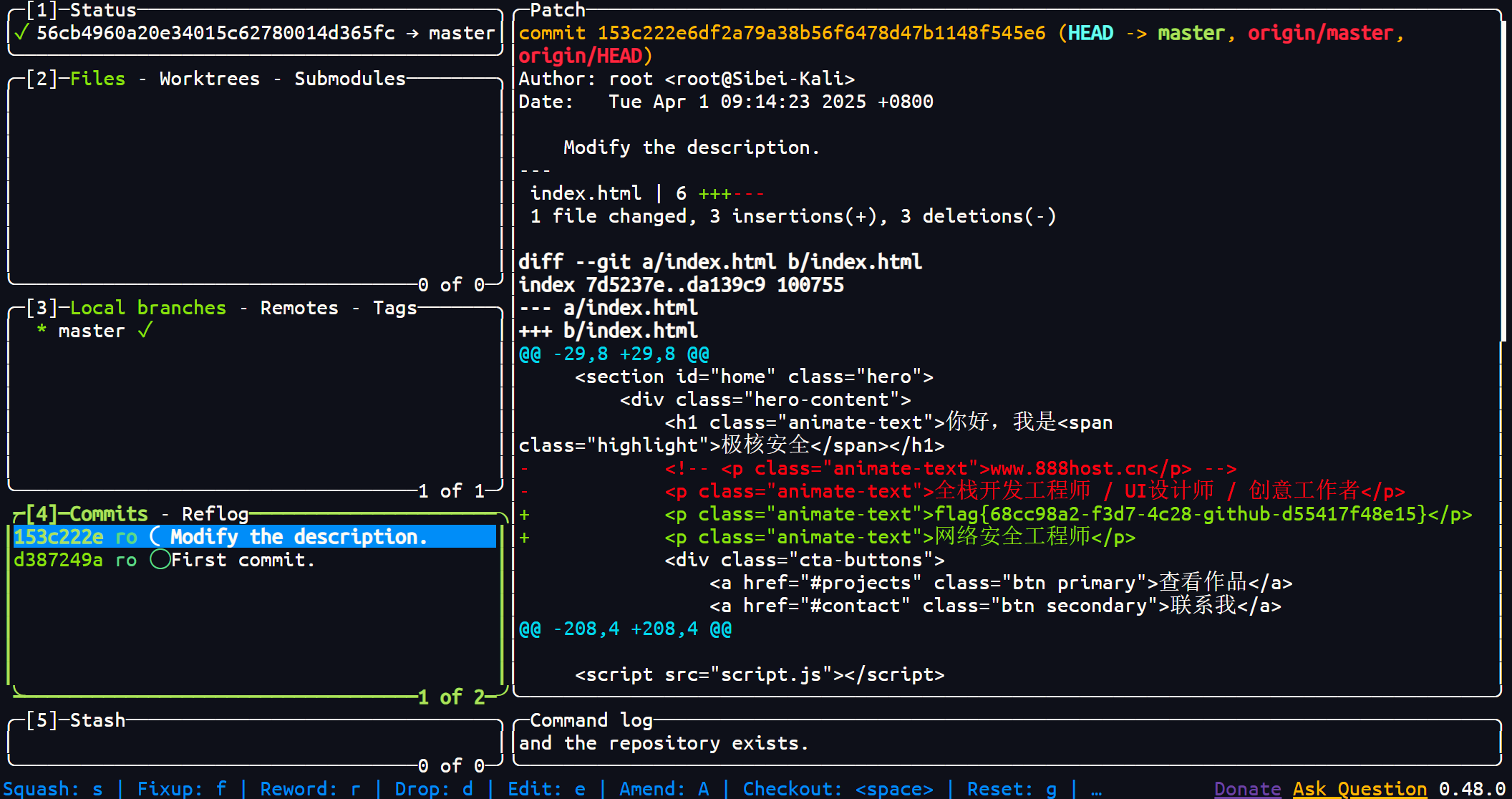 先使用 githacker 将 .git 目录打包下载下来,然后使用 lazygit 工具查看之前的提交,得到 flag