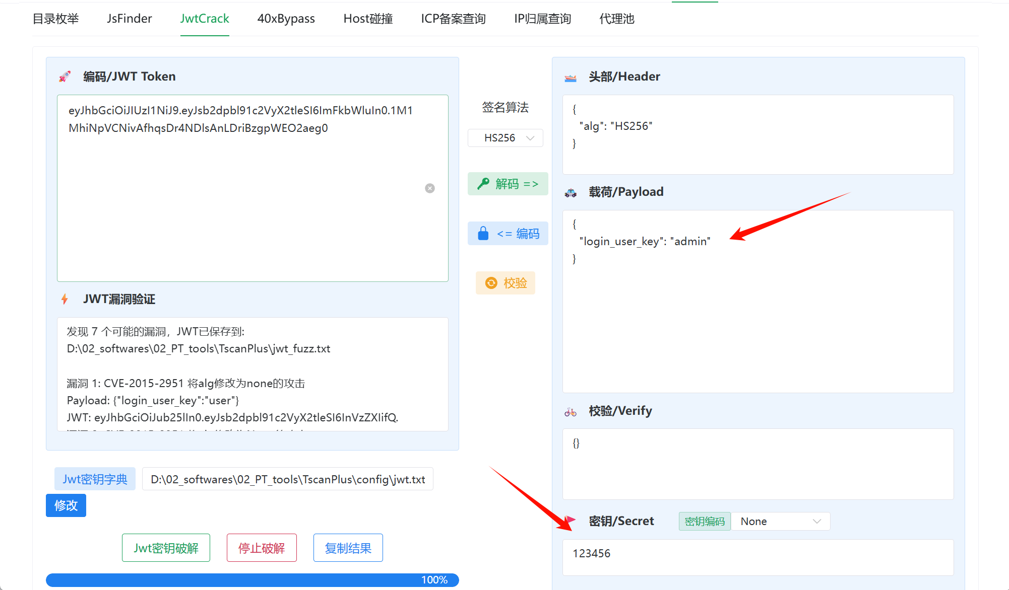 在 cookie 中拿到 jwt,使用的是 HS256 算法,爆破拿到密钥 123456,修改 login_user_key 字段为 admin,再重新加密,将重新加密后的 jwt 放入cookie 中,刷新即可进入管理员界面
