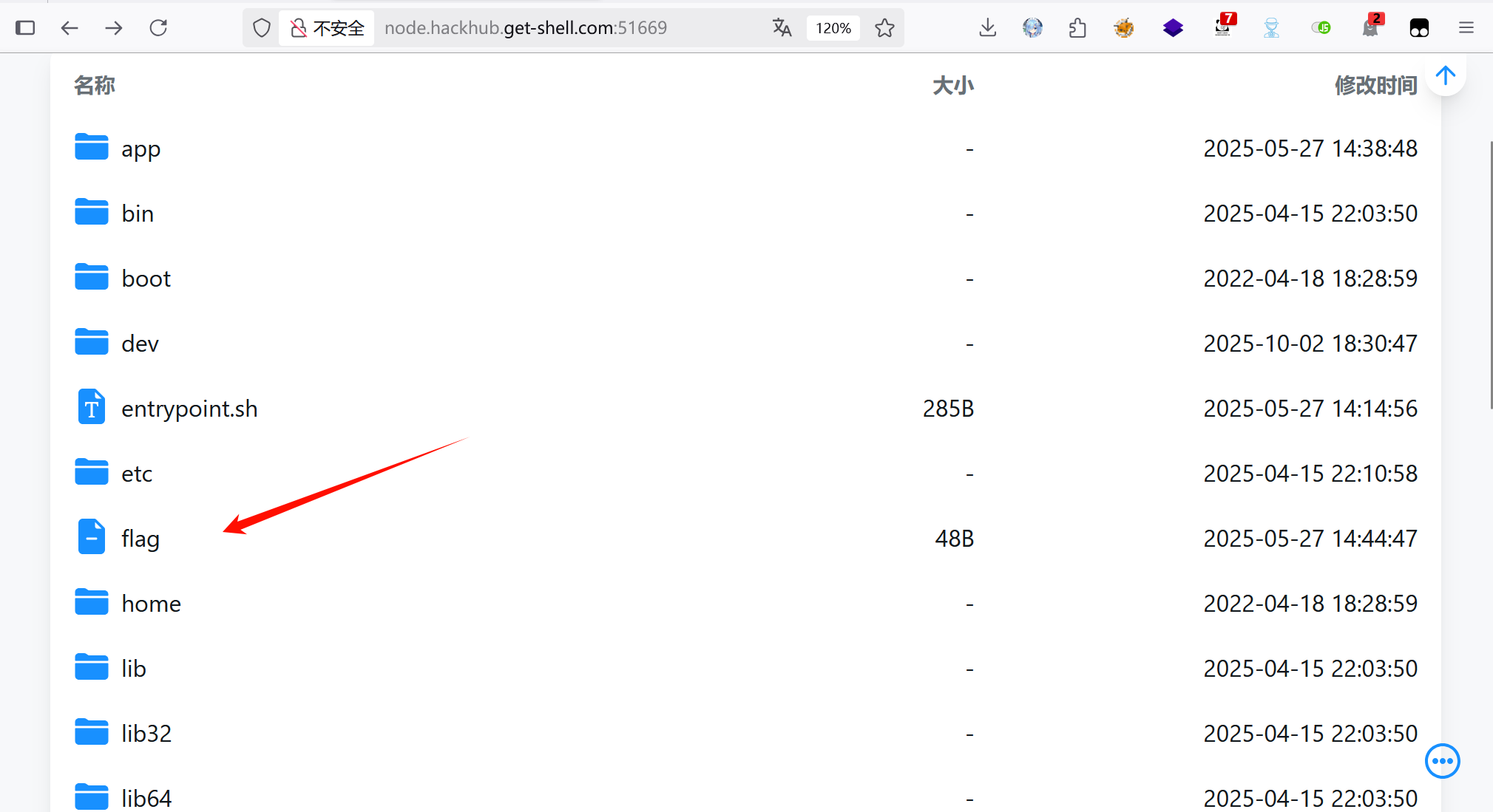 再次访问主界面就可以看到机器根目录下的文件,得到 flag