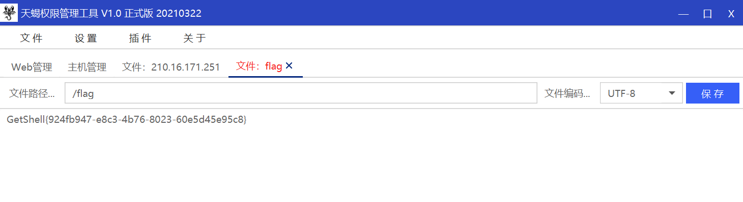 上传该 war 文件,访问 /api/api.jsp 路由,发现成功解析,天蝎成功连接,拿到 flag