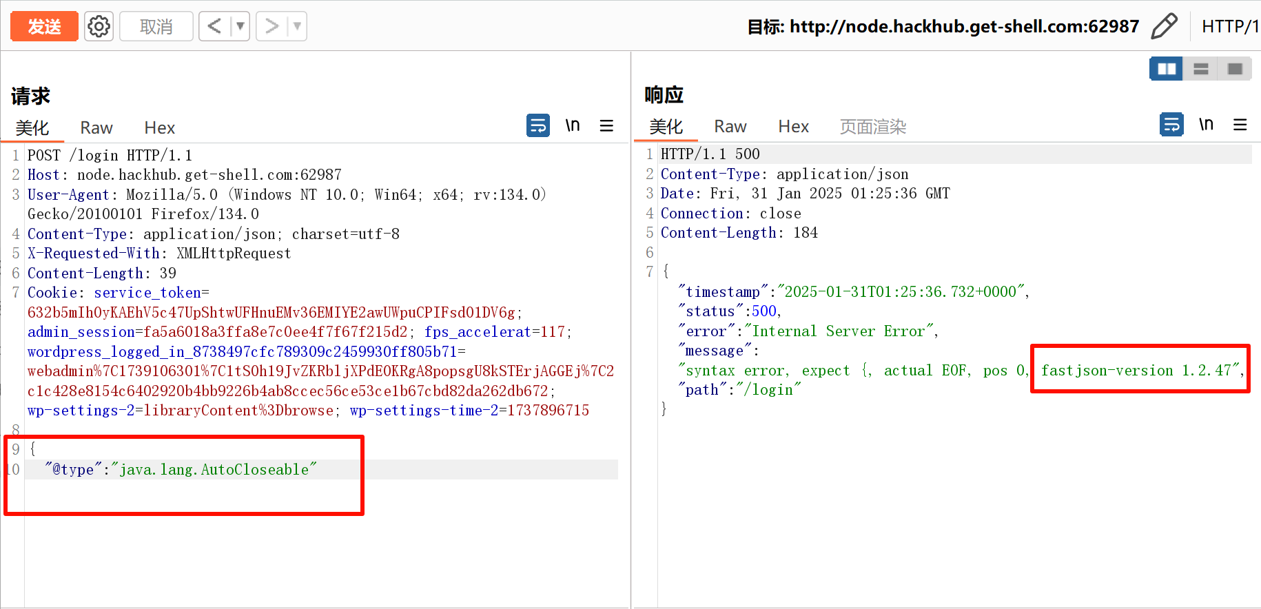 利用报错查看精确版本号,fastjson1.2.47,网上自己找找相关漏洞文章